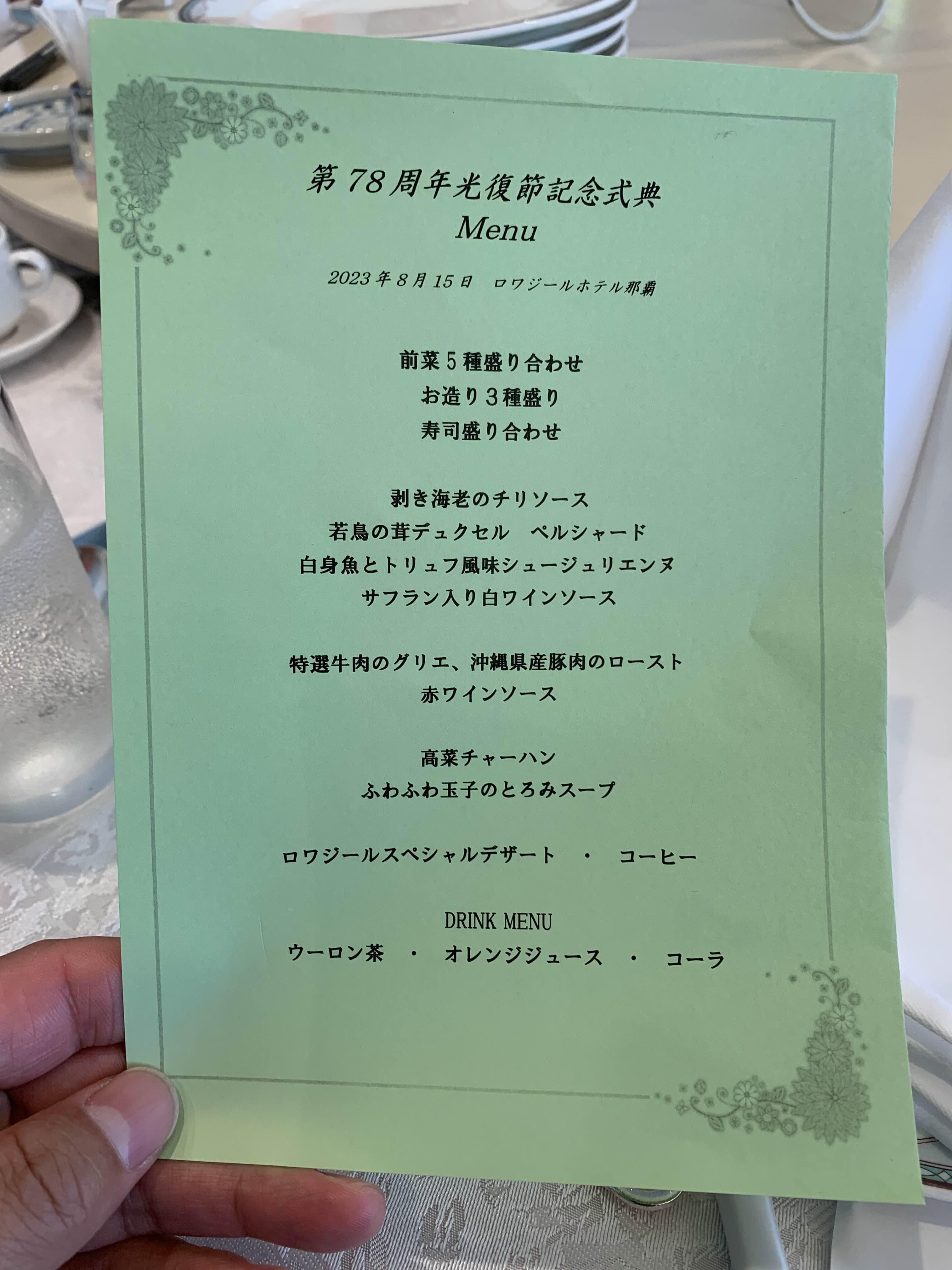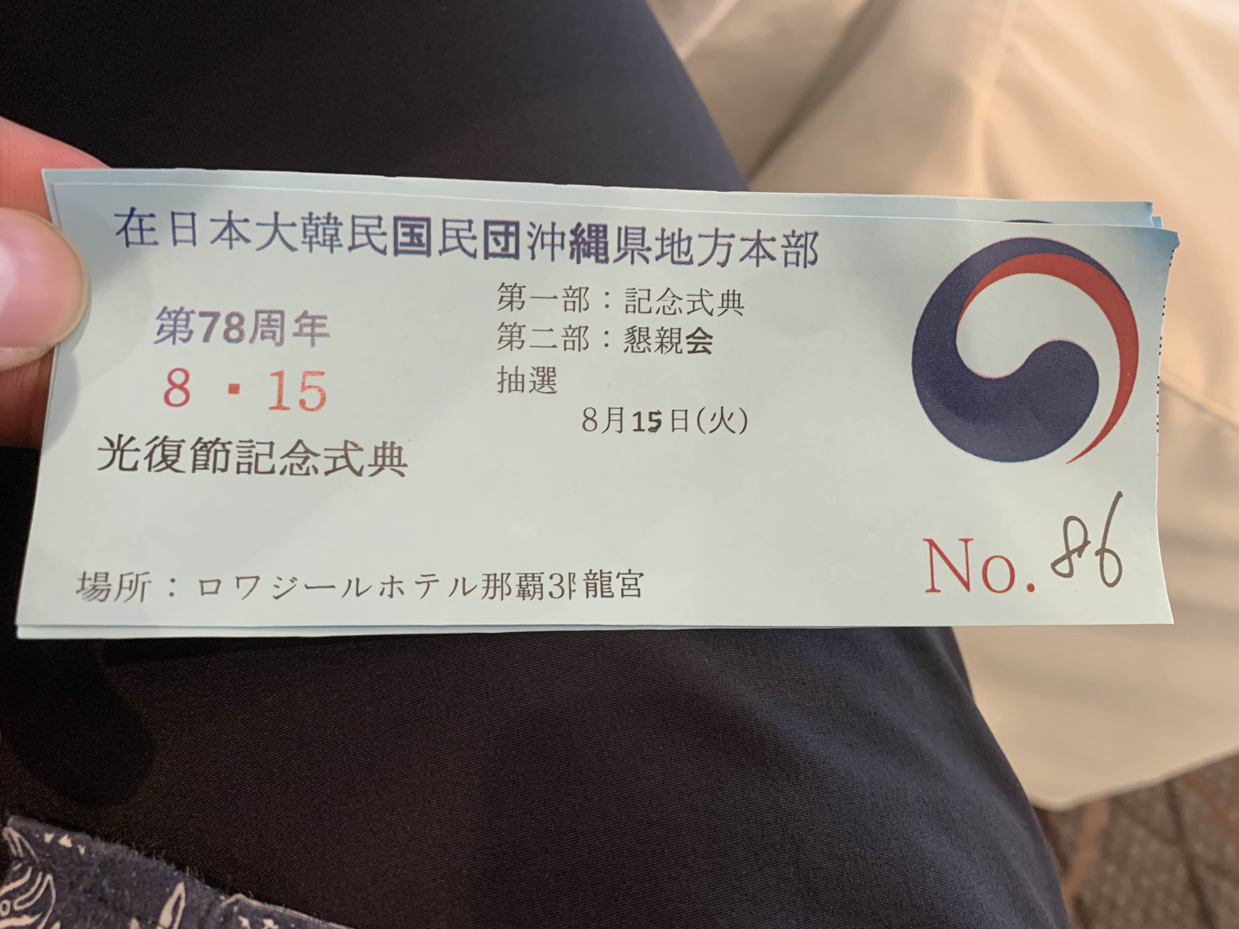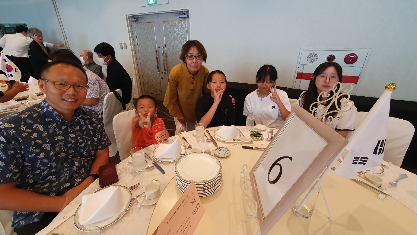 장로님과 아이들 4명만 데리고 나하시 르와지르 호텔에서 하는 78주년 광복절 행사에 참석하다. 문은식집사님과 진에어 에 근무하는 김한슬집사도 만났다. 참석한 6명 중에 행운권 경품을 3명이나 받았다. 이것도 처음 있는 일이었다.