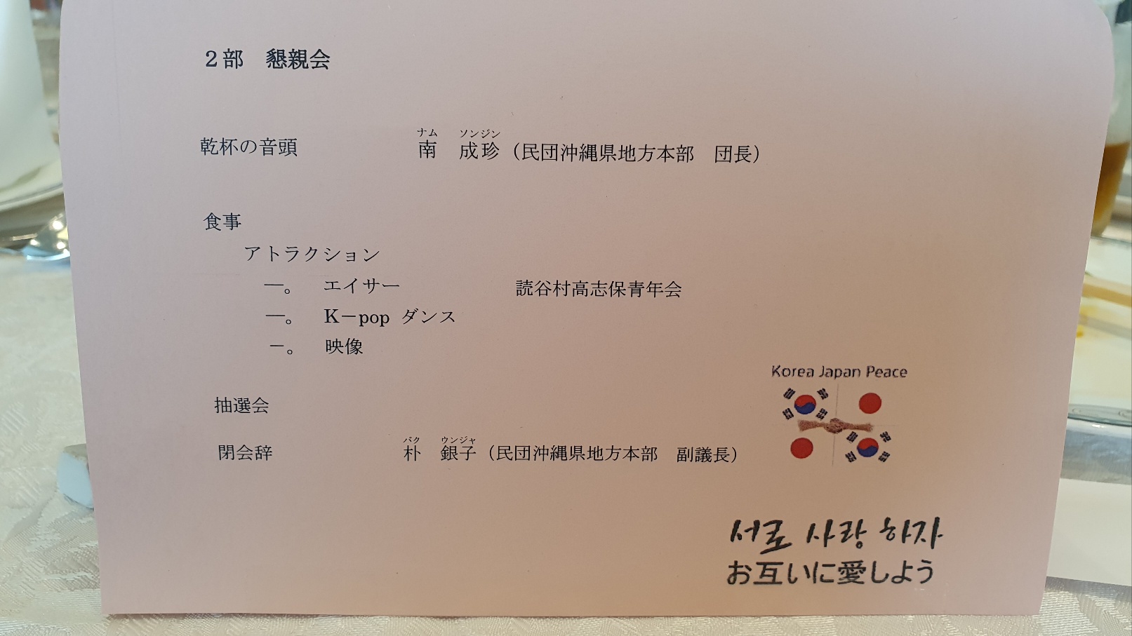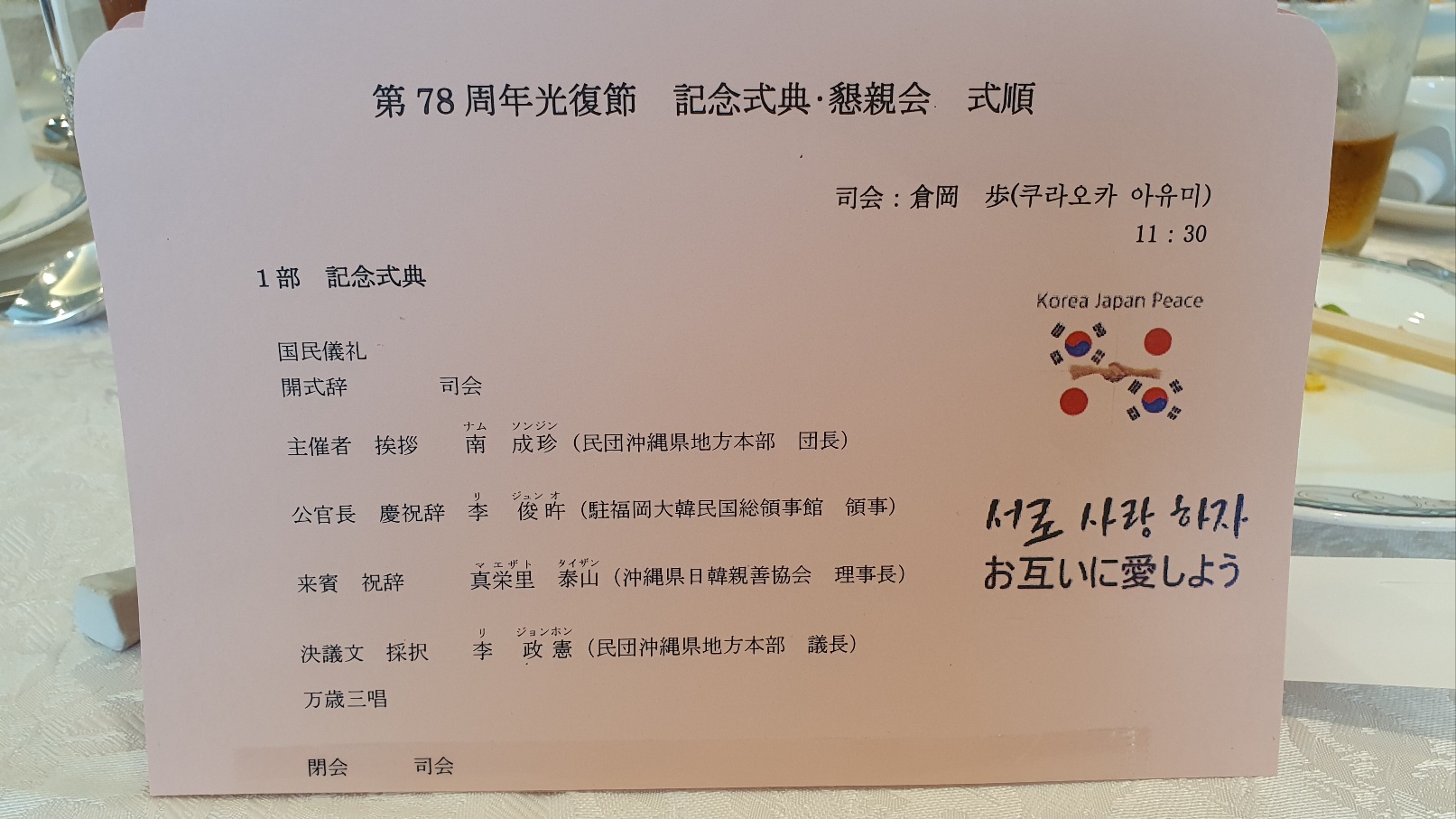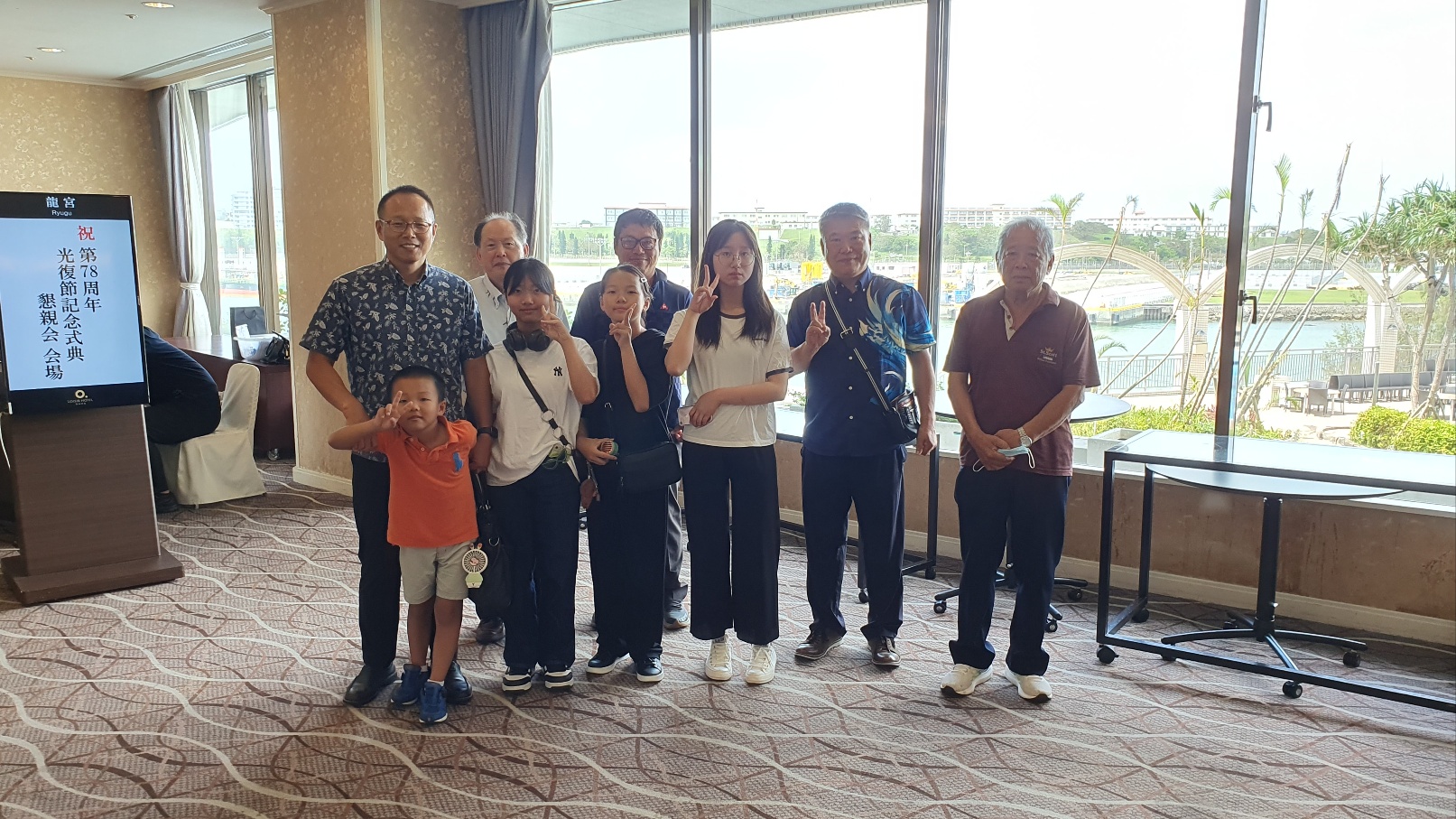 장로님과 아이들 4명만 데리고 나하시 르와지르 호텔에서 하는 78주년 광복절 행사에 참석하다. 문은식집사님과 진에어 에 근무하는 김한슬집사도 만났다. 참석한 6명 중에 행운권 경품을 3명이나 받았다. 이것도 처음 있는 일이었다.