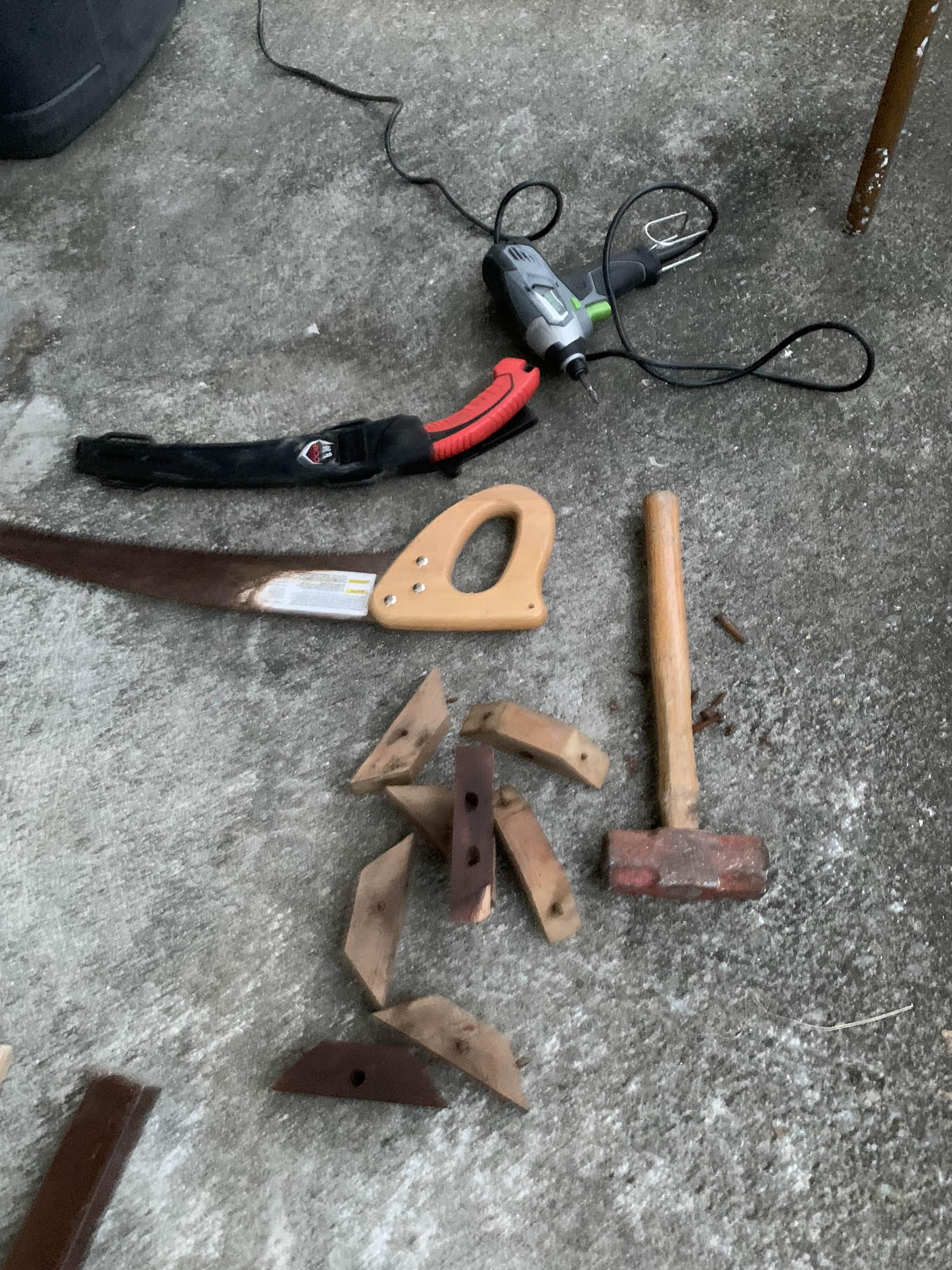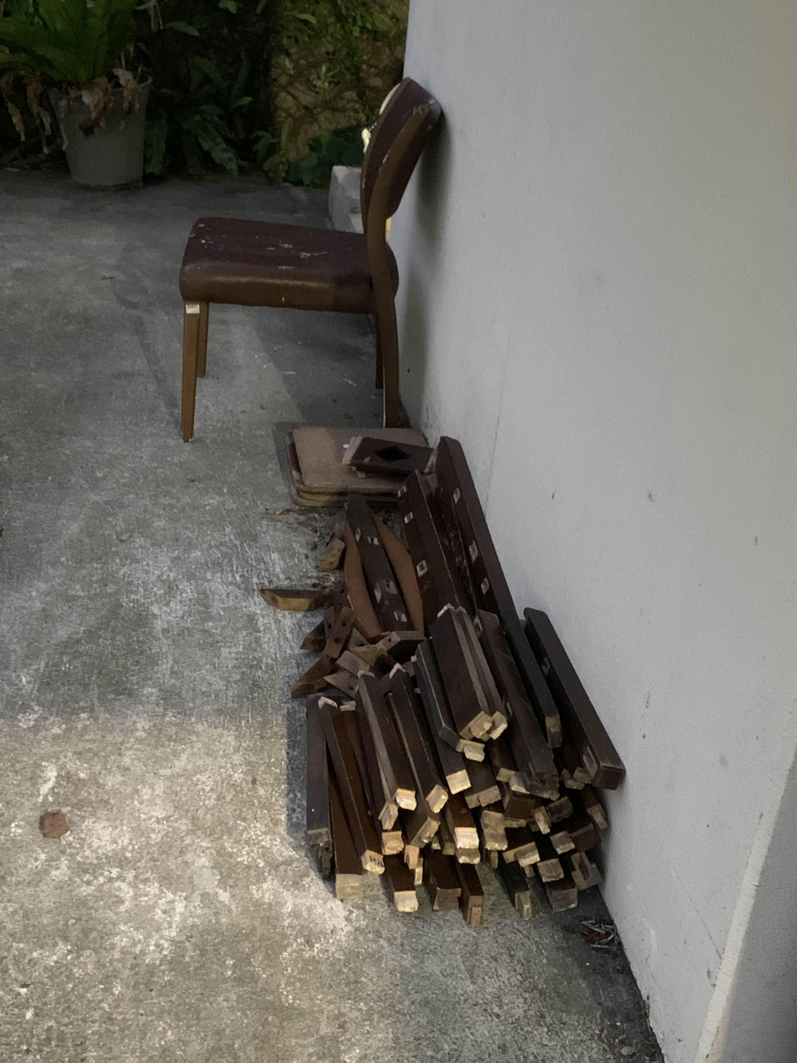 인사동 식당에서 오키나와 교회 식당까지 와서 의자로써의 삶을 살고 더 이상 쓰임받지 못하고 누구의 눈에도 들지 못하고 수개월동안 밖에 방치되었던 의자들을 경건한 마음으로 해체했습니다. 잘 만드는 재능은 없어도 잘 부수고 해체하는 재능이 있는 것 같습니다. 재미가 있어서 모기가 수없이 물었는데 끝까지 마무리 할 수 있었습니다.