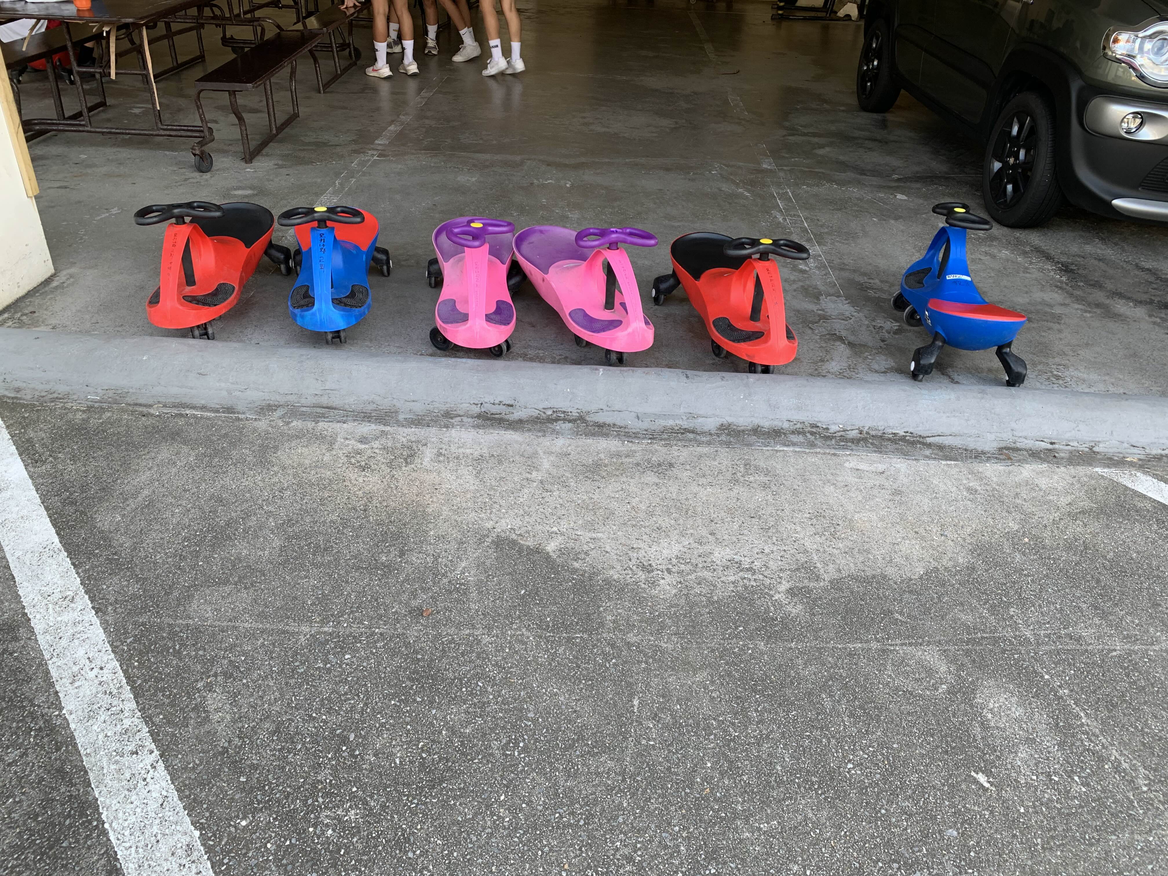 오늘은 어제 더 많은 아이들이 놀기 시작해서 오전에 중학교 선생님 두 명이 왔다 갔으니깐 시끄럽지 않게 놀라고 했더니 어제보다 더 조용히 놀다 갔다. 또 스윙카를 타고 놀다가 사진처럼 주차를 해 놓았다.