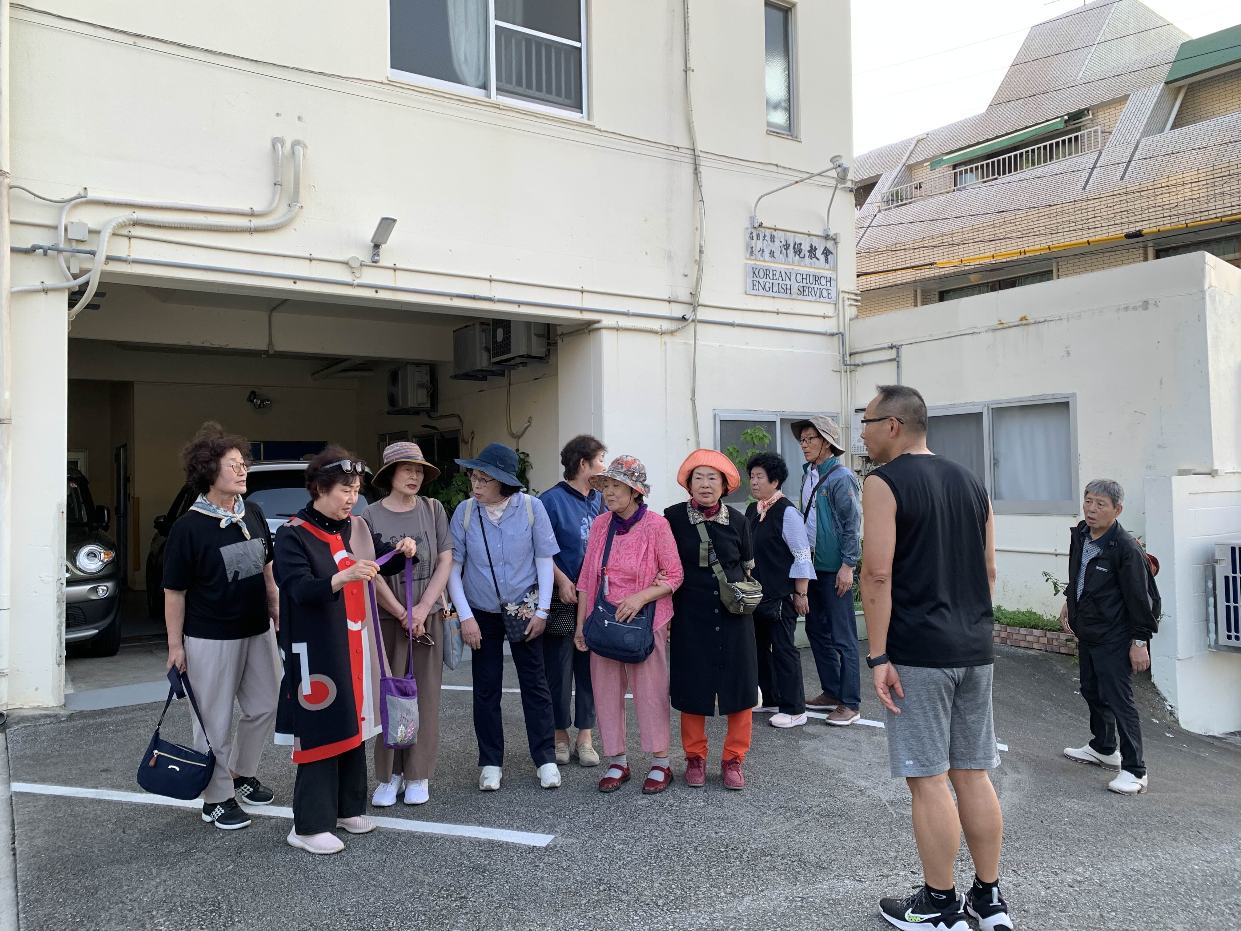2박3일 패키지 중에 교회를 방문하신 동광교회 한나회 권사님들이시다. 7시에 오신다고 해서 고3아이들과 농구하다가 샤워하려고 하는데 교회 밑 패밀리마트에 도착했다고 해서 운동복 복장으로 샤워도 못하고 안내를 해 드렸다. 6:20분에 도착한 권사님.