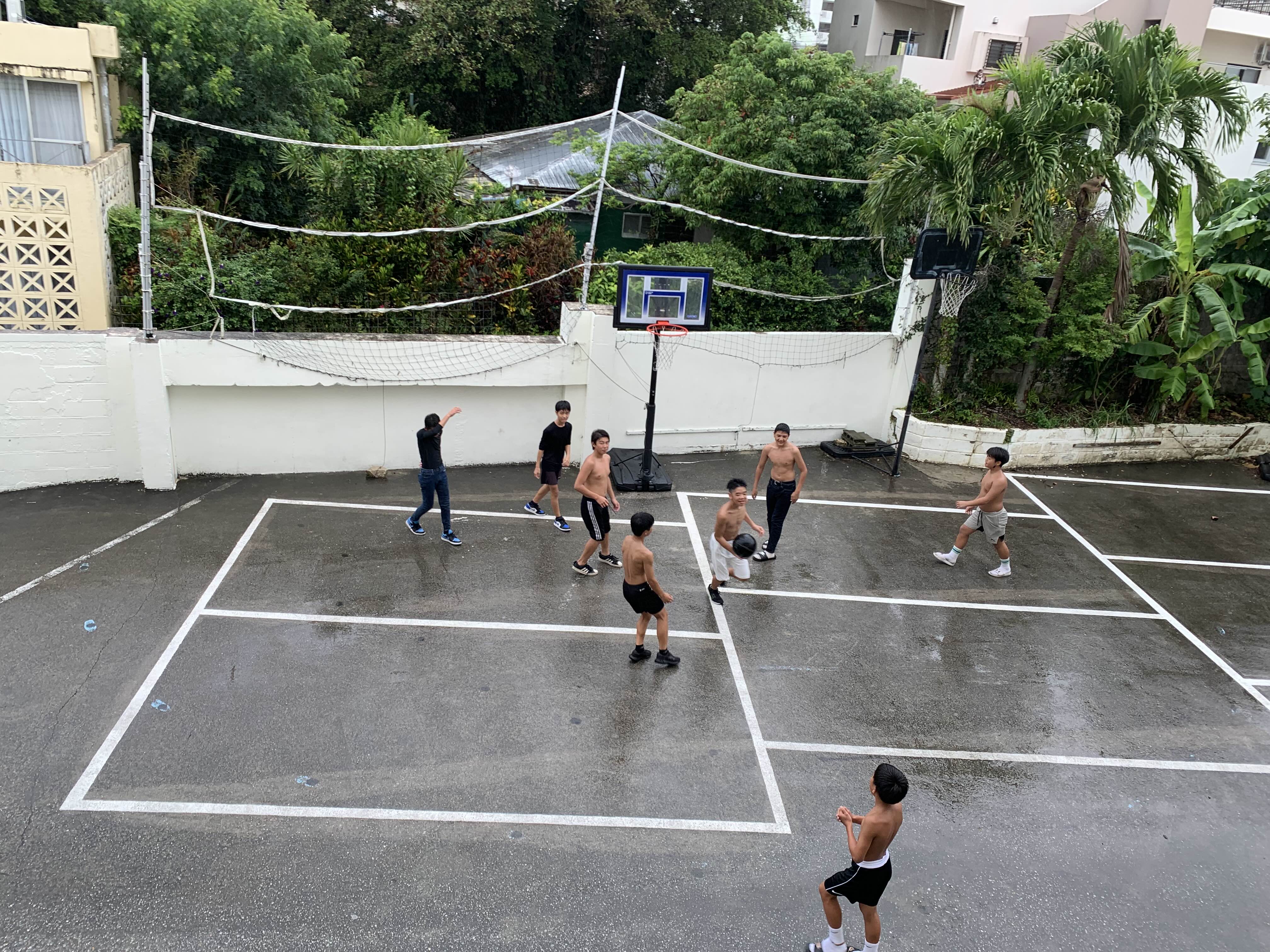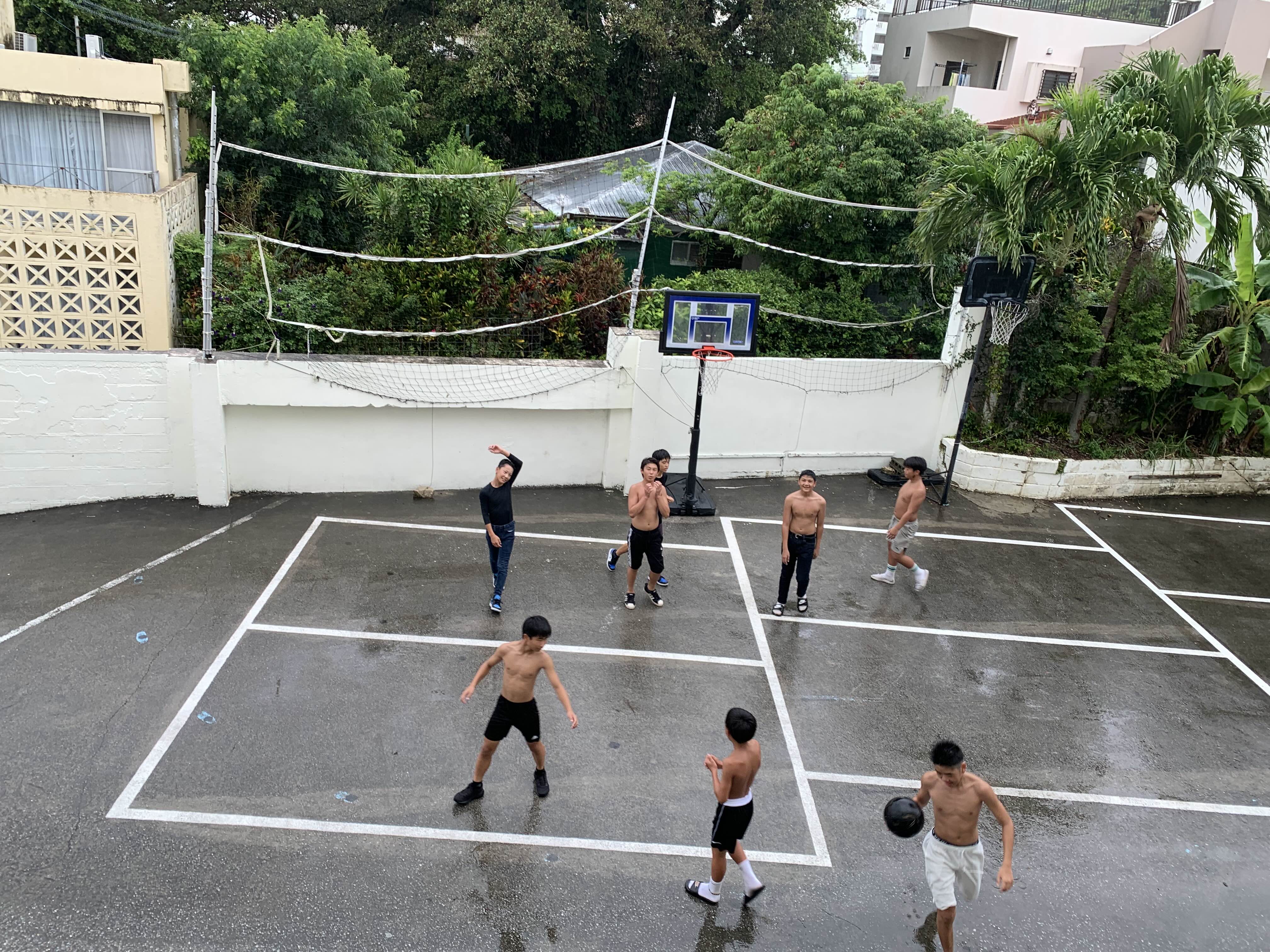 주일 오후 4시경 비가 오는데 신이나서 윗옷 벗고 빗맞으면 농구한다. 소리 지르지 말고 농구하라고 주의를 주었지만 안된다.