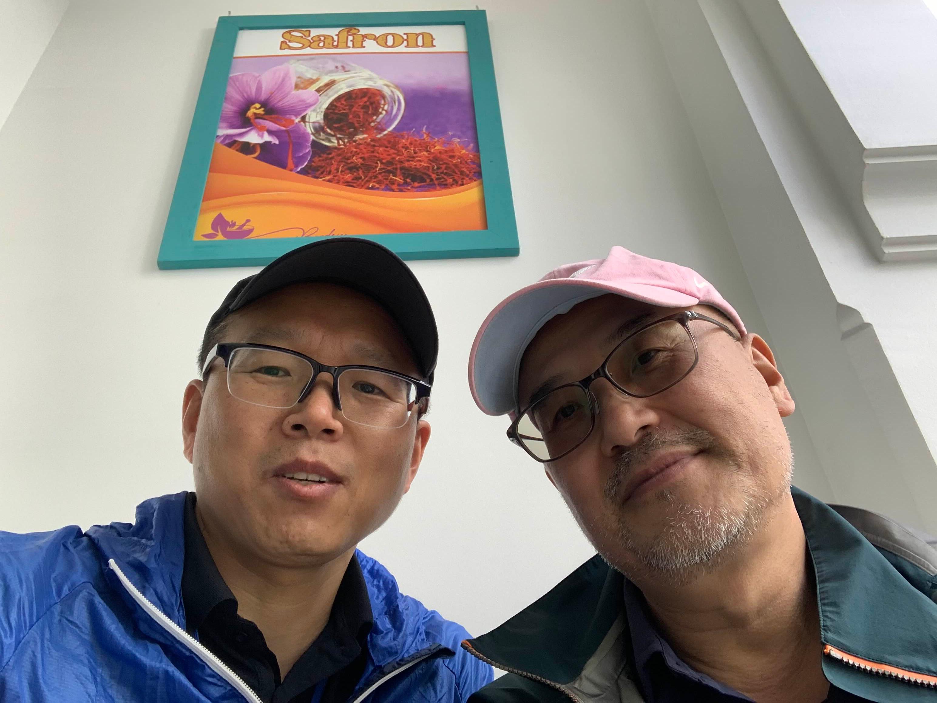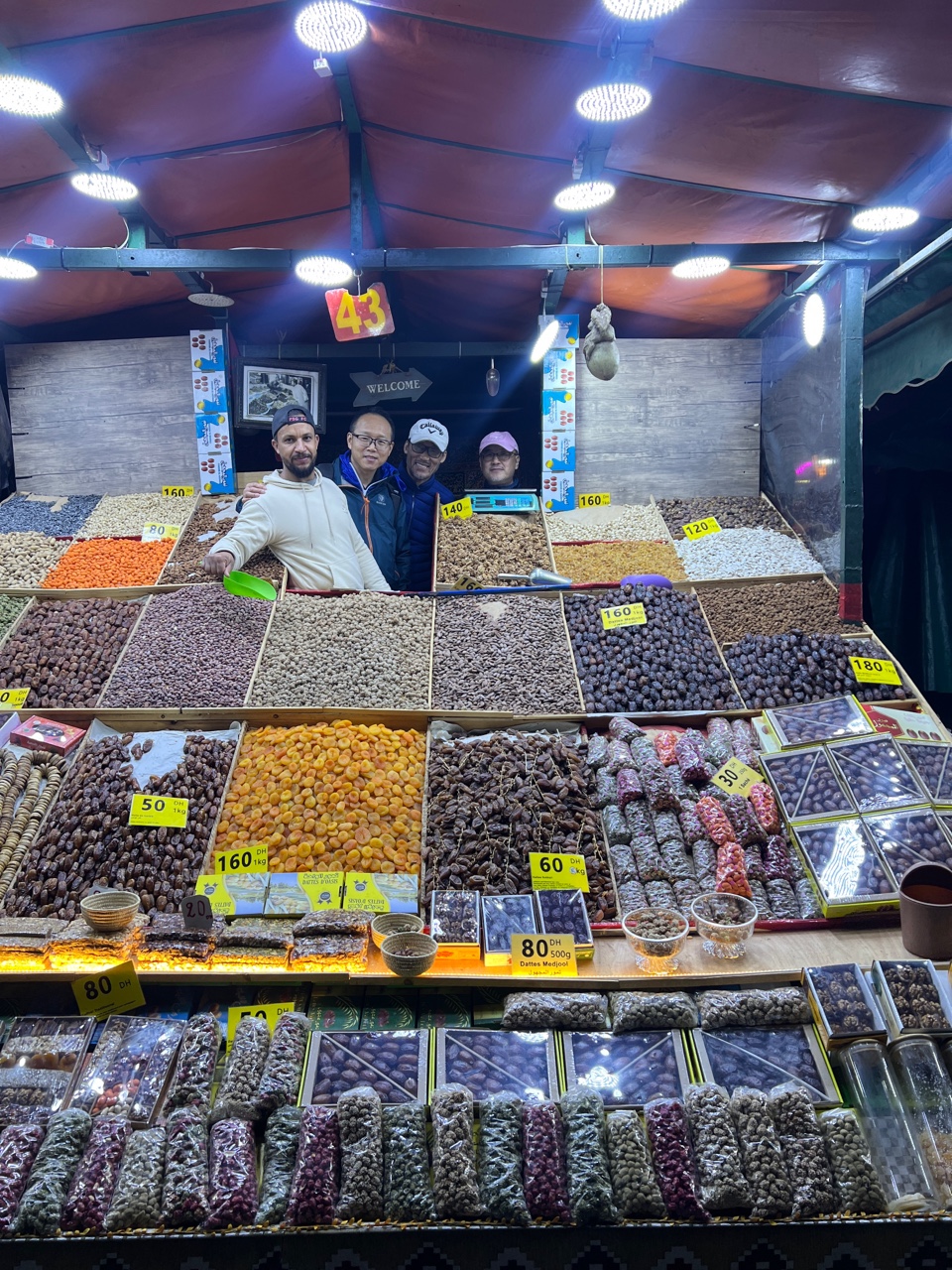 야시장에서 곡물과 말린 열매파는 시장인과 사진을 찍다