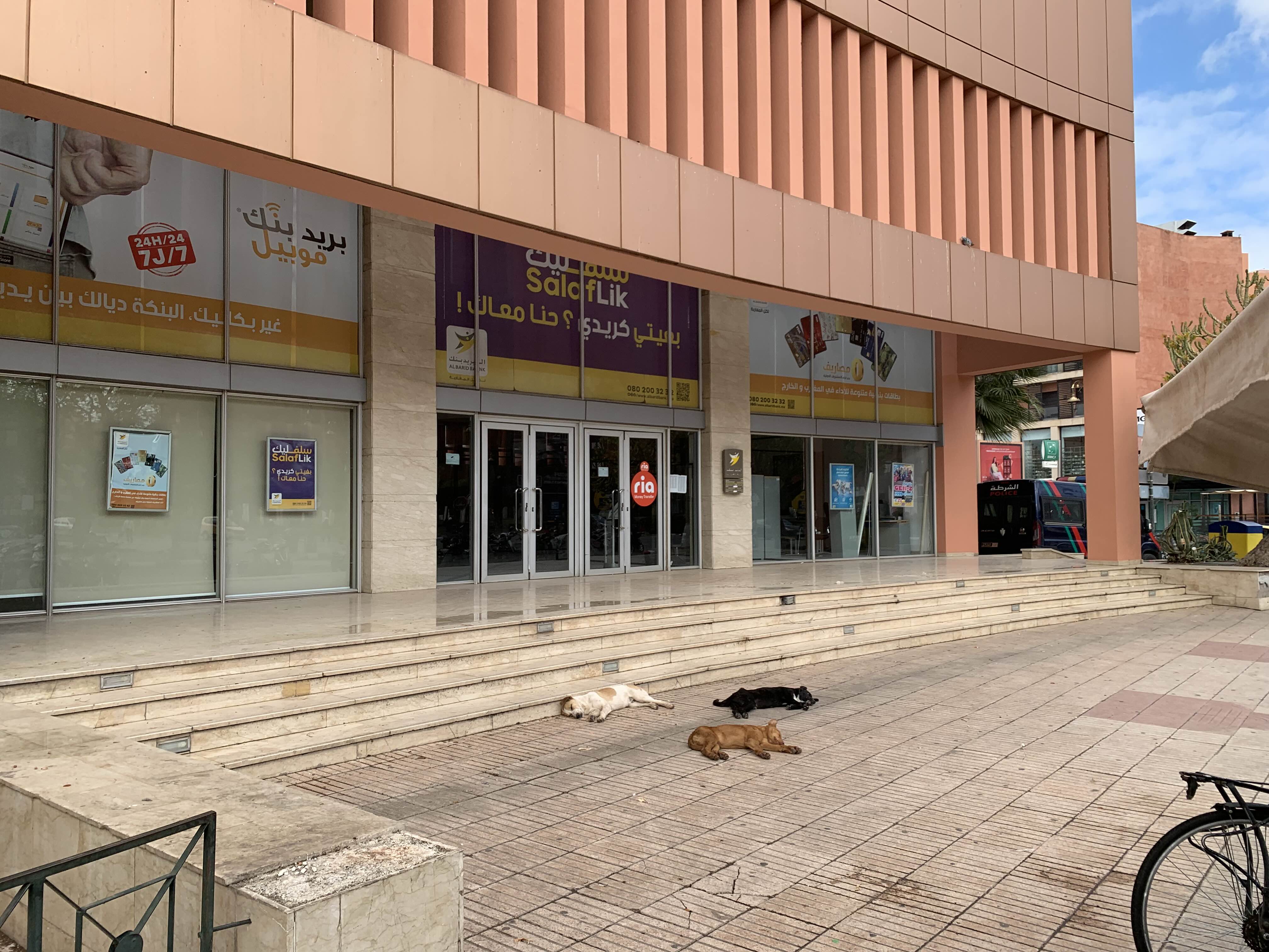 마라케시 시내 번화가 상가 앞에 개 3마리가 자고 있다. 개들도 밤새 라마단을 지켜 피곤했나보다. 라마단 기간에는 하루 종일 금식하고 해가 지는 순간부터 밤늦게 식사를 하고 잔다는 것이다. 평소보다 라마단 기간에 식사 소비량이 더 많다고 함.