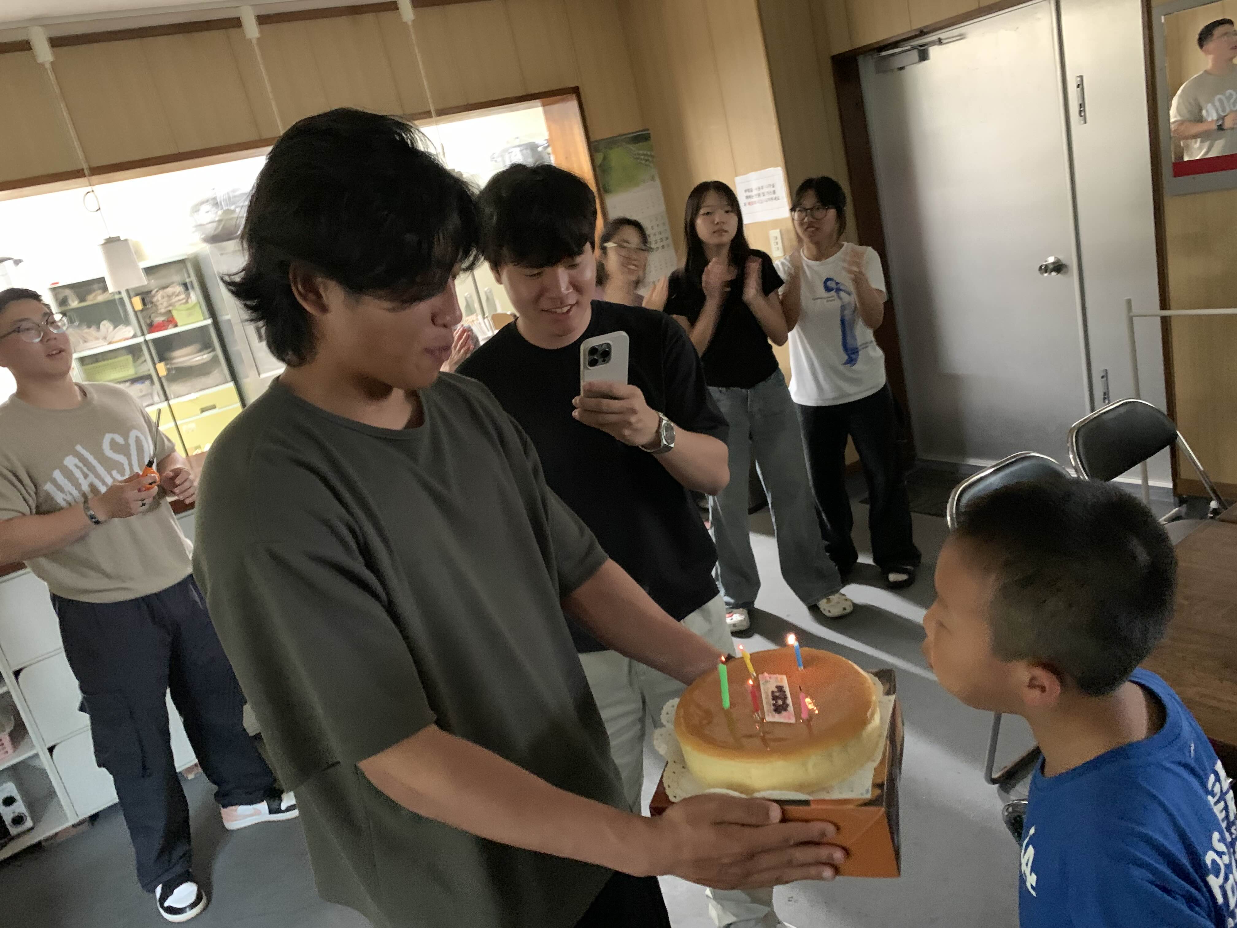나온이는 오키나와에서 태어났는데 올해 생일은 주일 25일이었다. 매월 첫주에 5월 생일자와 기념일이 있는 분들을 축하해주는데 이번 달은 첫주가 야외예배로 드려 케익대신 미니도나츠로 축하해 주었다. 생일 케익을 원해서 나온이가 좋아하는 치즈케익을 사서 식사 후에 남아 계신 분들이랑 축하해주었다.