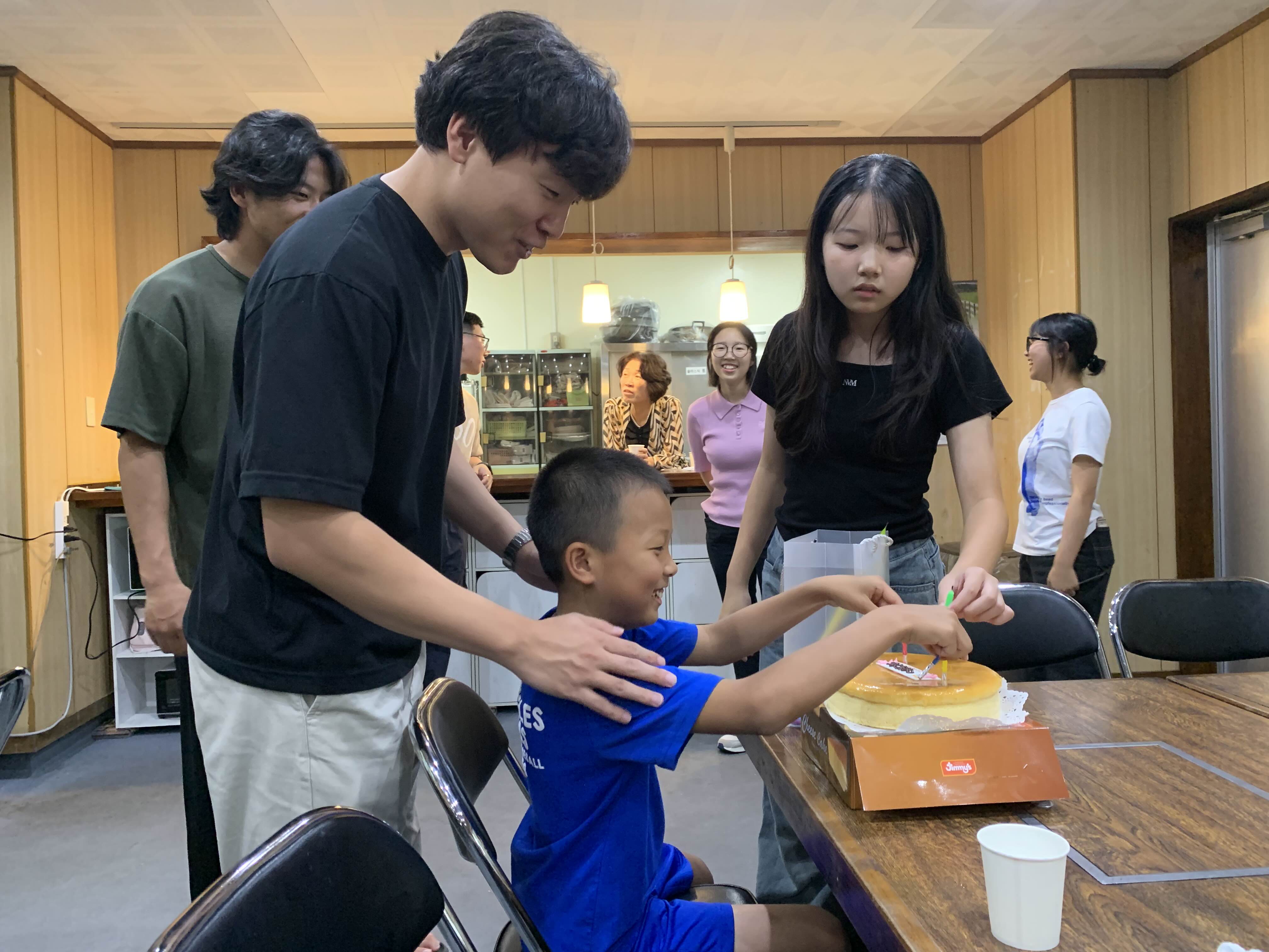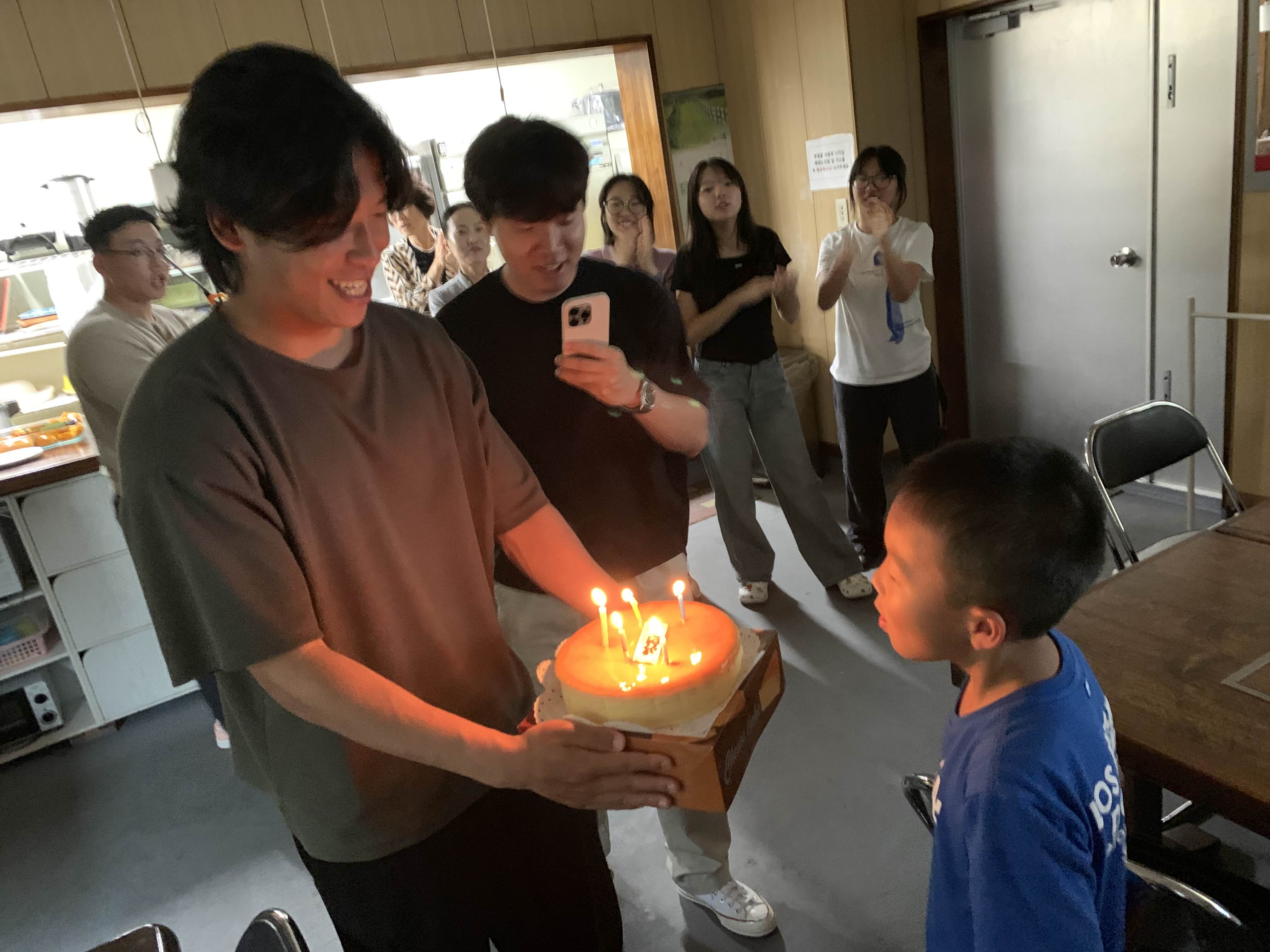 나온이는 오키나와에서 태어났는데 올해 생일은 주일 25일이었다. 매월 첫주에 5월 생일자와 기념일이 있는 분들을 축하해주는데 이번 달은 첫주가 야외예배로 드려 케익대신 미니도나츠로 축하해 주었다. 생일 케익을 원해서 나온이가 좋아하는 치즈케익을 사서 식사 후에 남아 계신 분들이랑 축하해주었다.