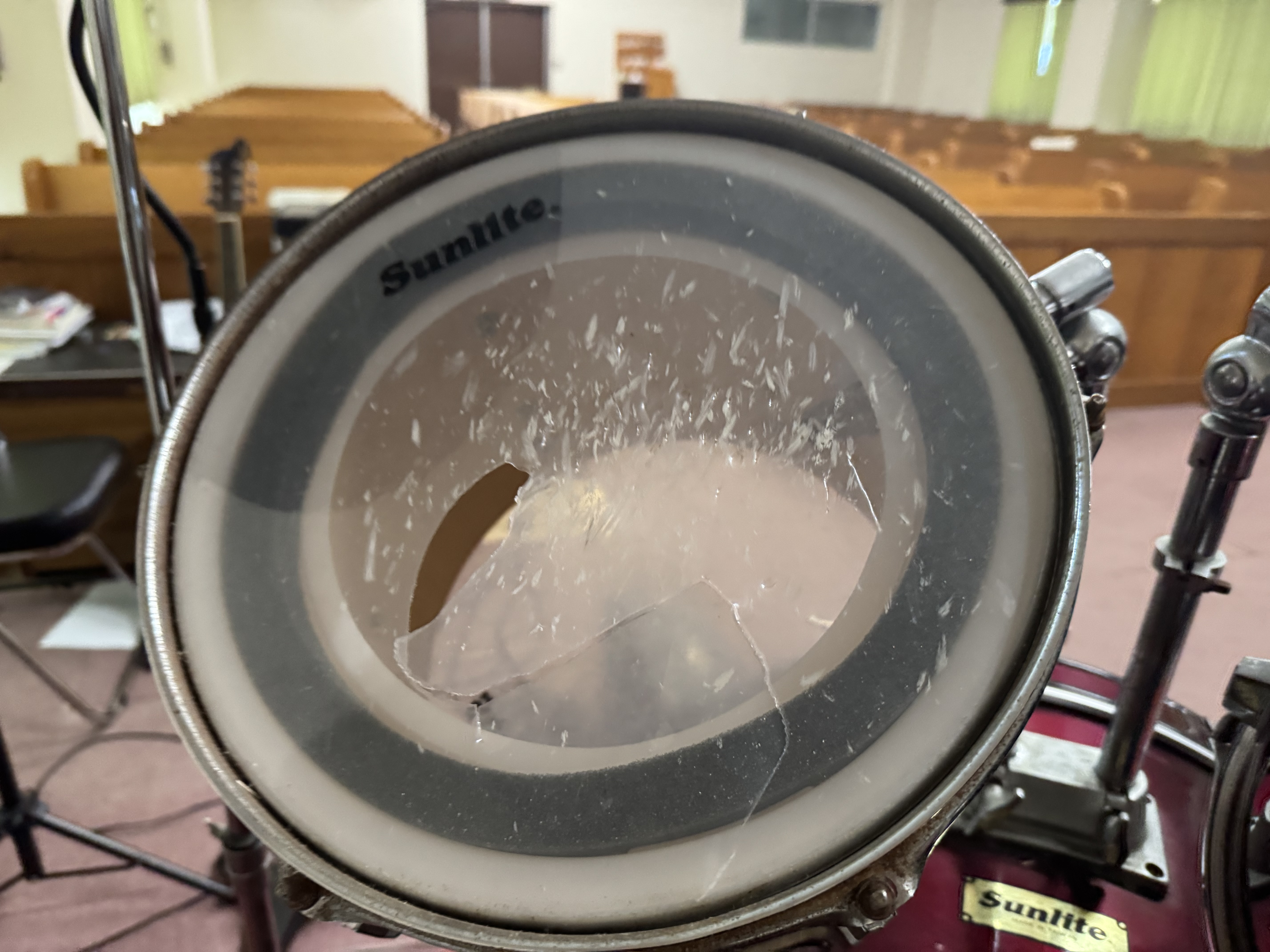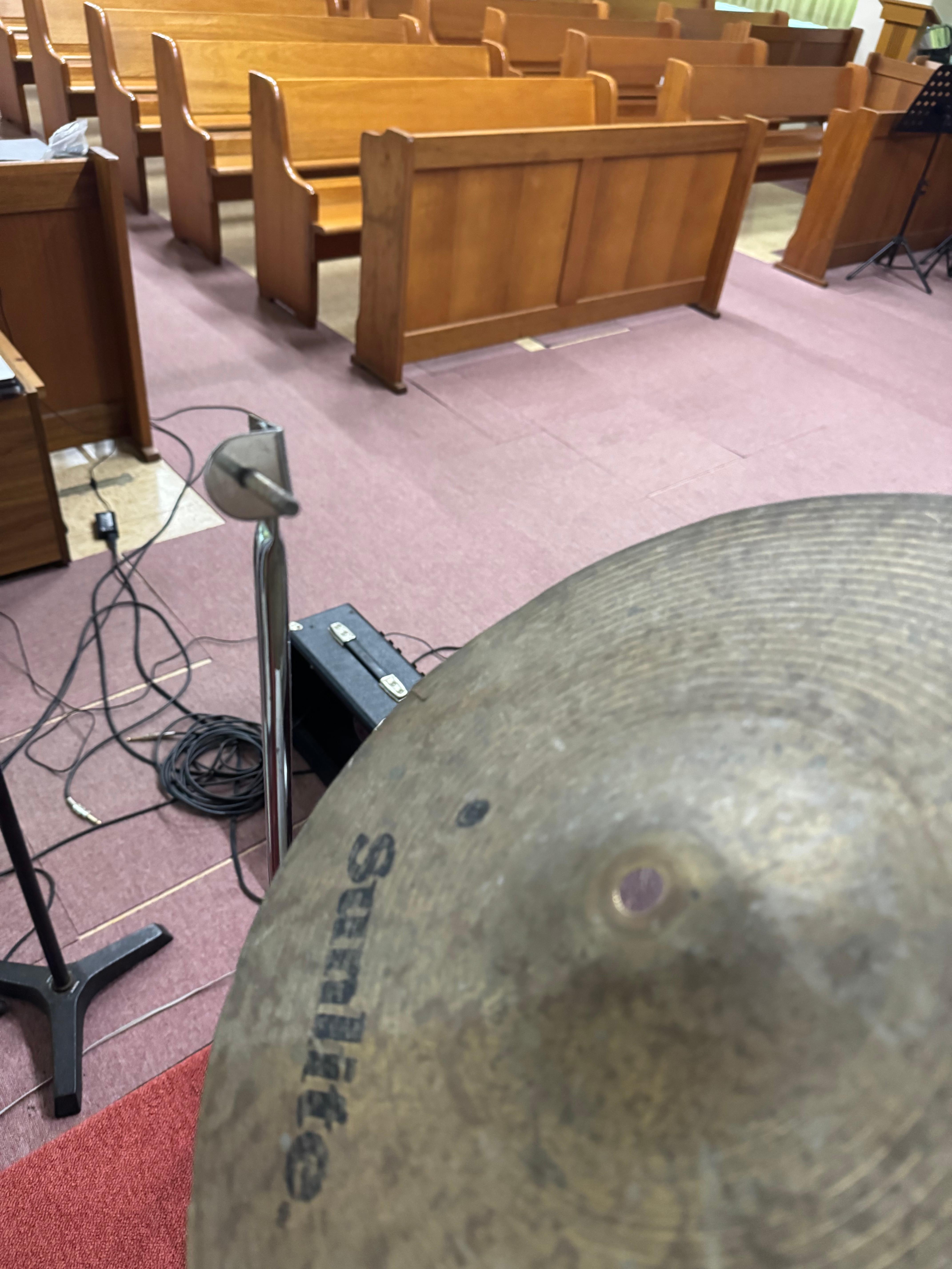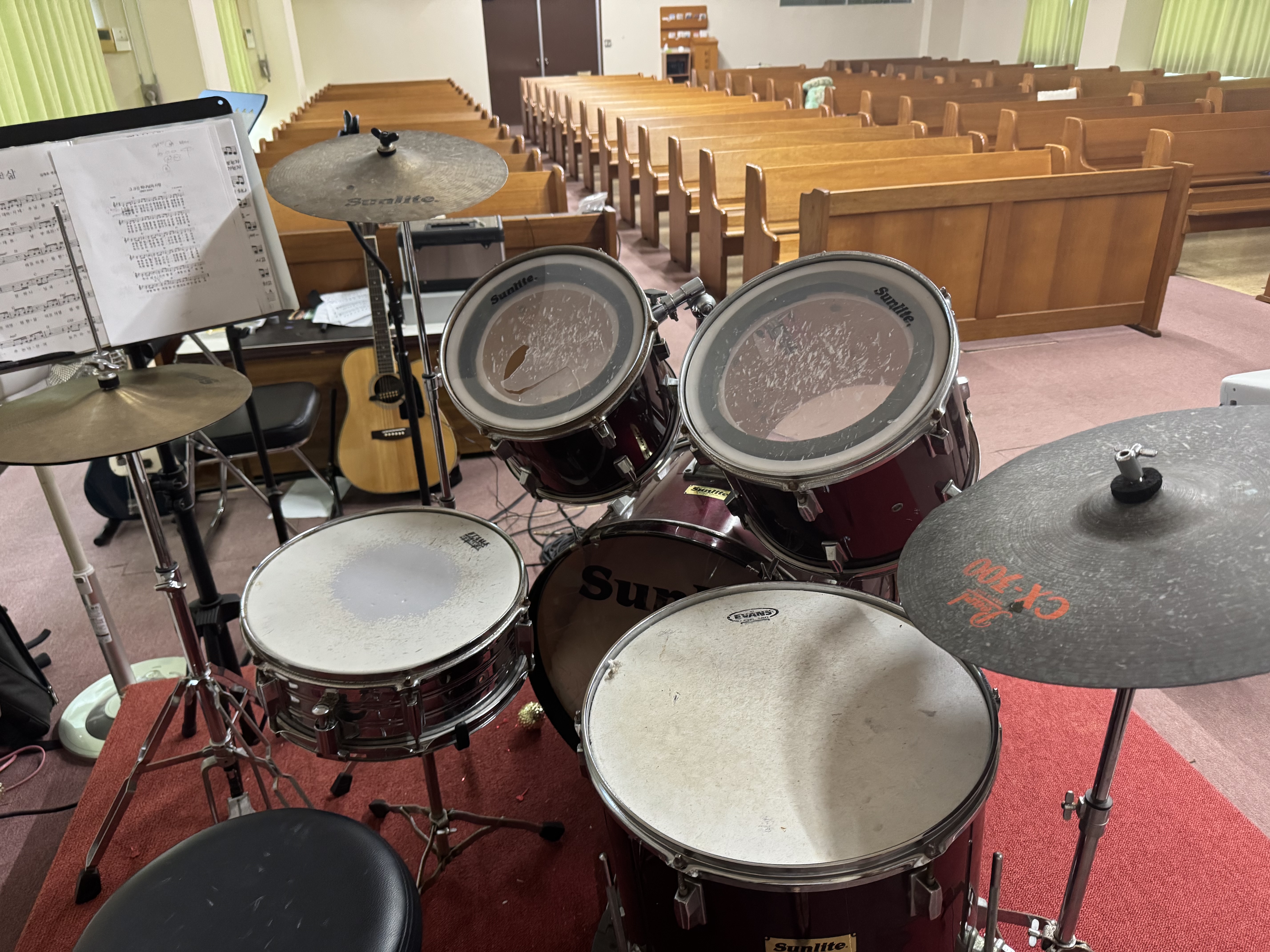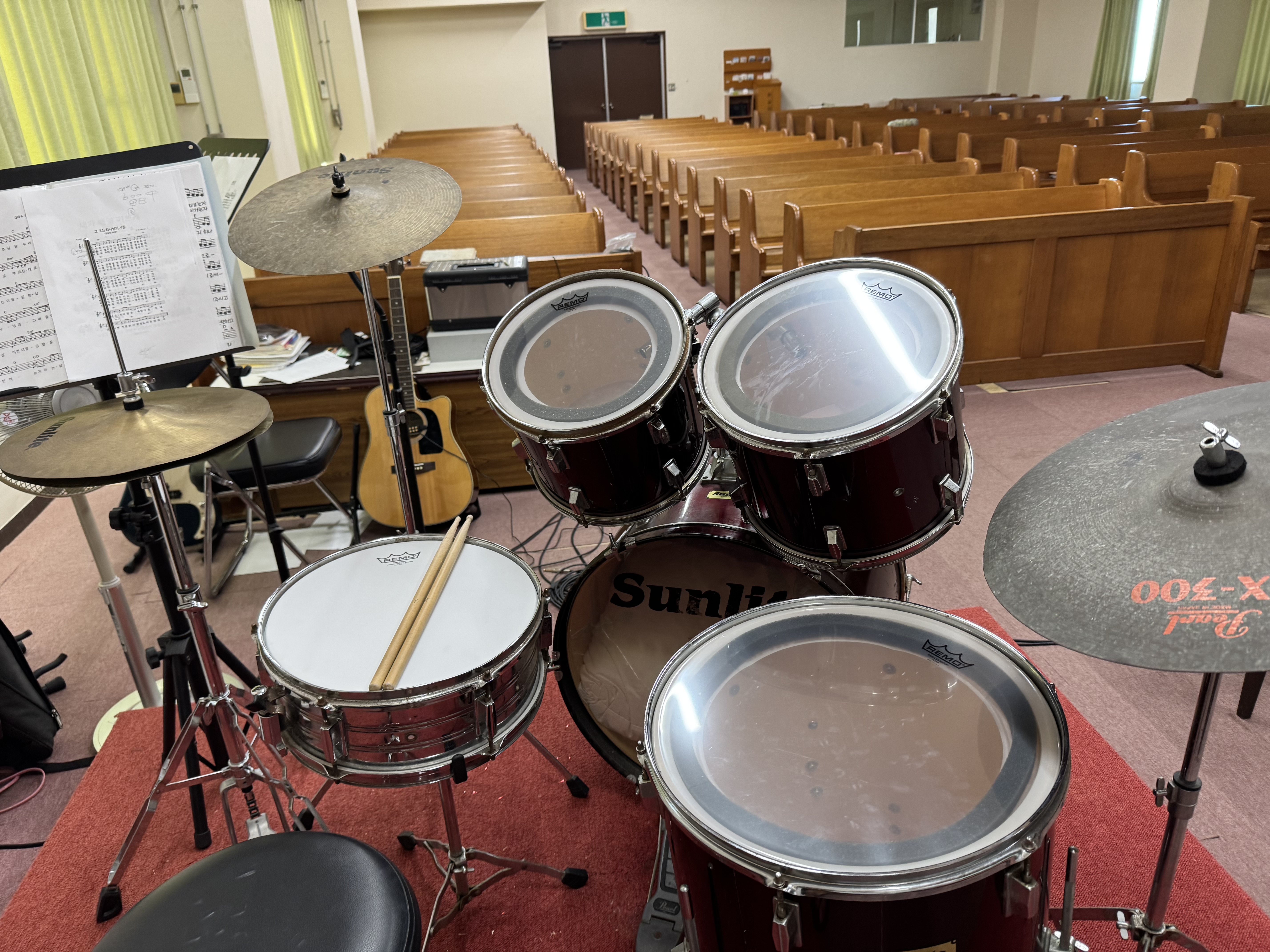 새롭게 교체하고 손을 본 드럼. 드러머가 사라지고 수년동안 네째 중2 하온이가 초5학년때부터 드럼을 쳤다. 드럼을 제대로 아는 사람이 없다가 최근에 등록한 김신원형제가 따끔하게(?), 그리고 꼼꼼하게 몇시간동안 드러머도 아닌데 손을 봐주었다.