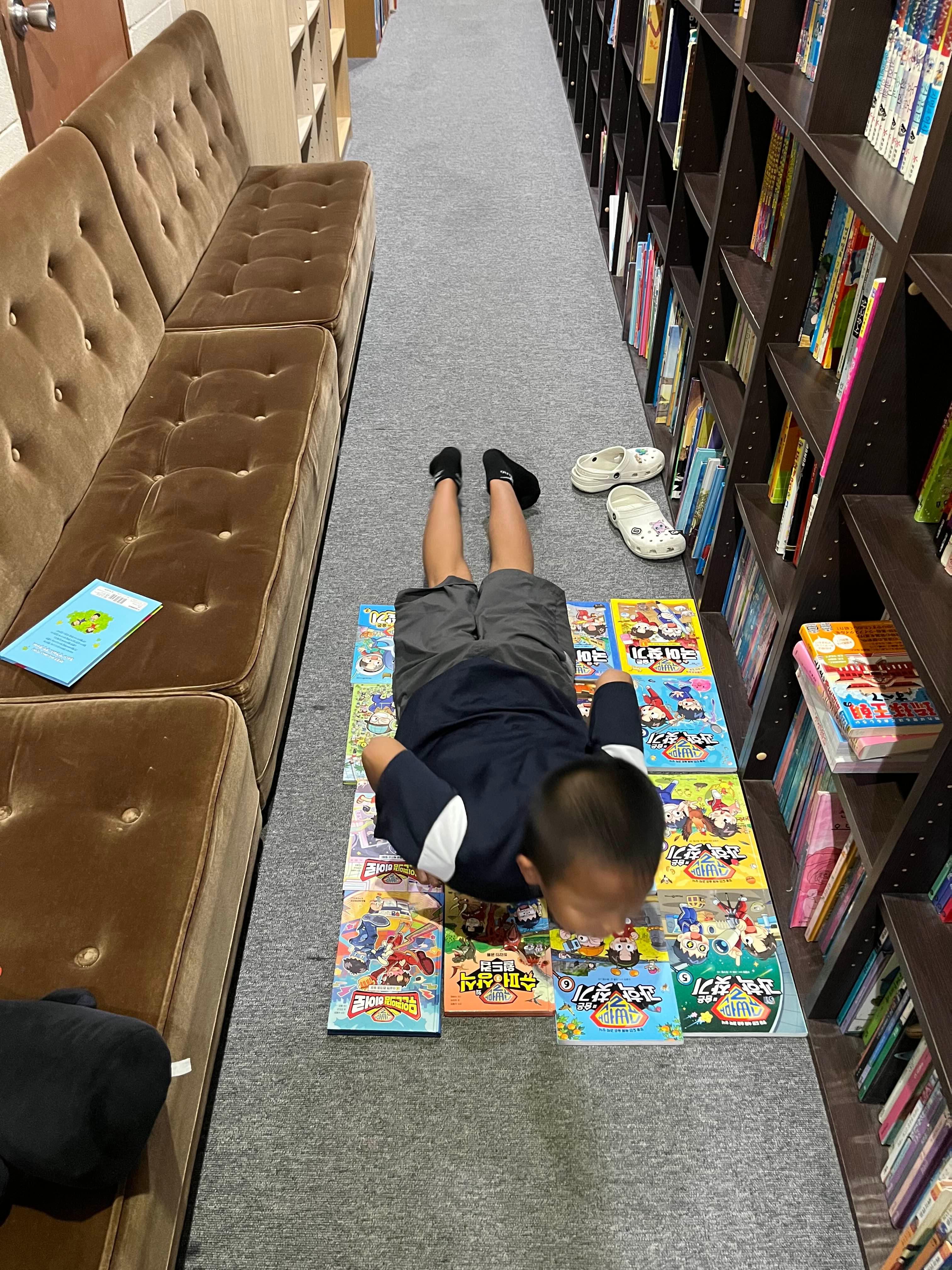 교회 2층에는 복도?도서관이 있다.  초3 어린이가 게임을 하지 않고 책만 읽는다. 그리고 다 읽고 또 읽고 한 책 위에 누웠다. 몇일 전만에도 핸드폰 게임기를 달고 살았다. 어떻게 이런 일이? 정답은 간단하다. 게임기 금지령이 내렸기 때문. 그것도 무기한 ㅎ