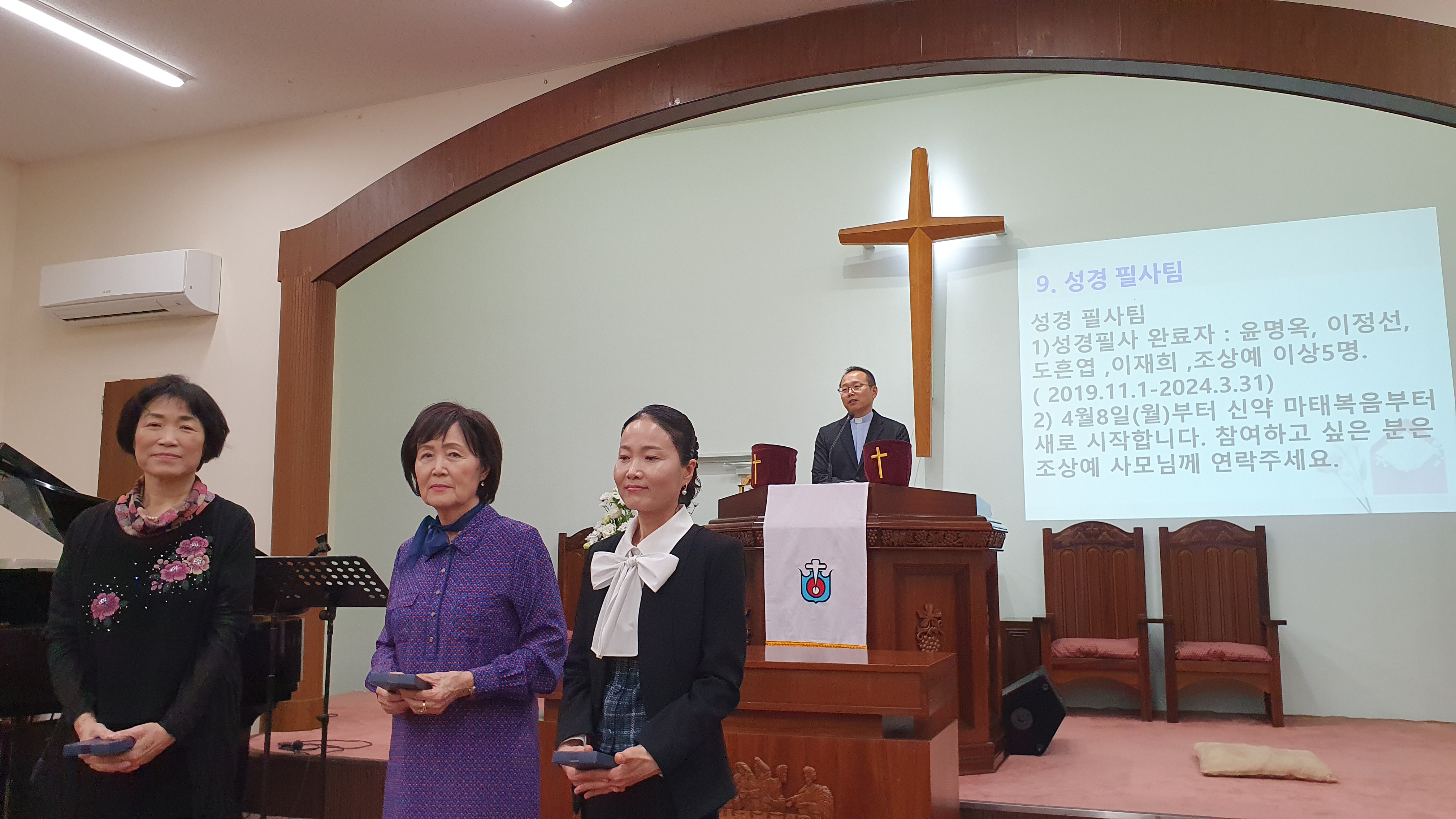2019.11.1-2024.3. 31까지 약 4년 5개월 동안 신약부터 시작해서 구약까지 완사했다. 처음 시작은 20명이 시작했지만 마지막까지 오신 분이 5명이었다. 윤명옥 권사님은 한국으로 들어가신 이후에도 제일 먼저 필사해서 필사방에 올려 놓으셨다고 한다. 이재희권사님은 한국출장이어서 참석하지 못하셨다. 부활절 때에 깜짝 선물을 준비해서 노고를 위로했다.