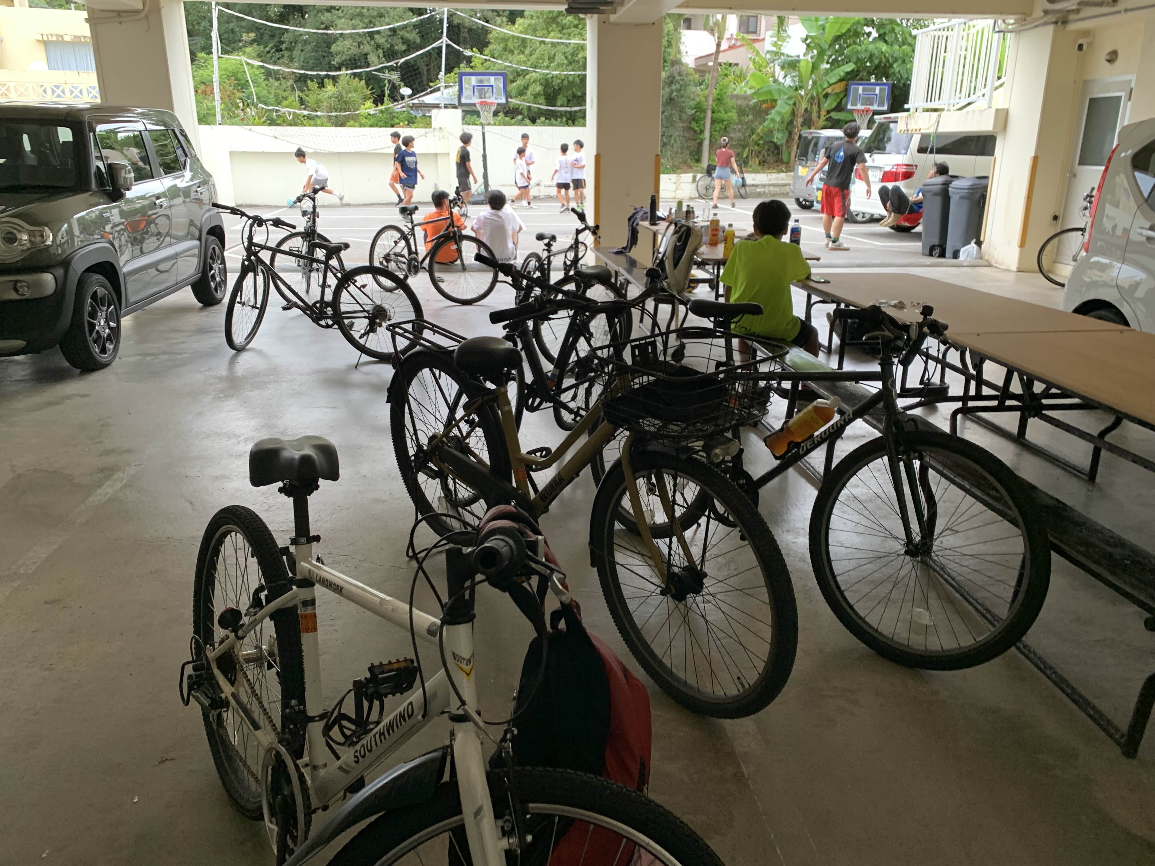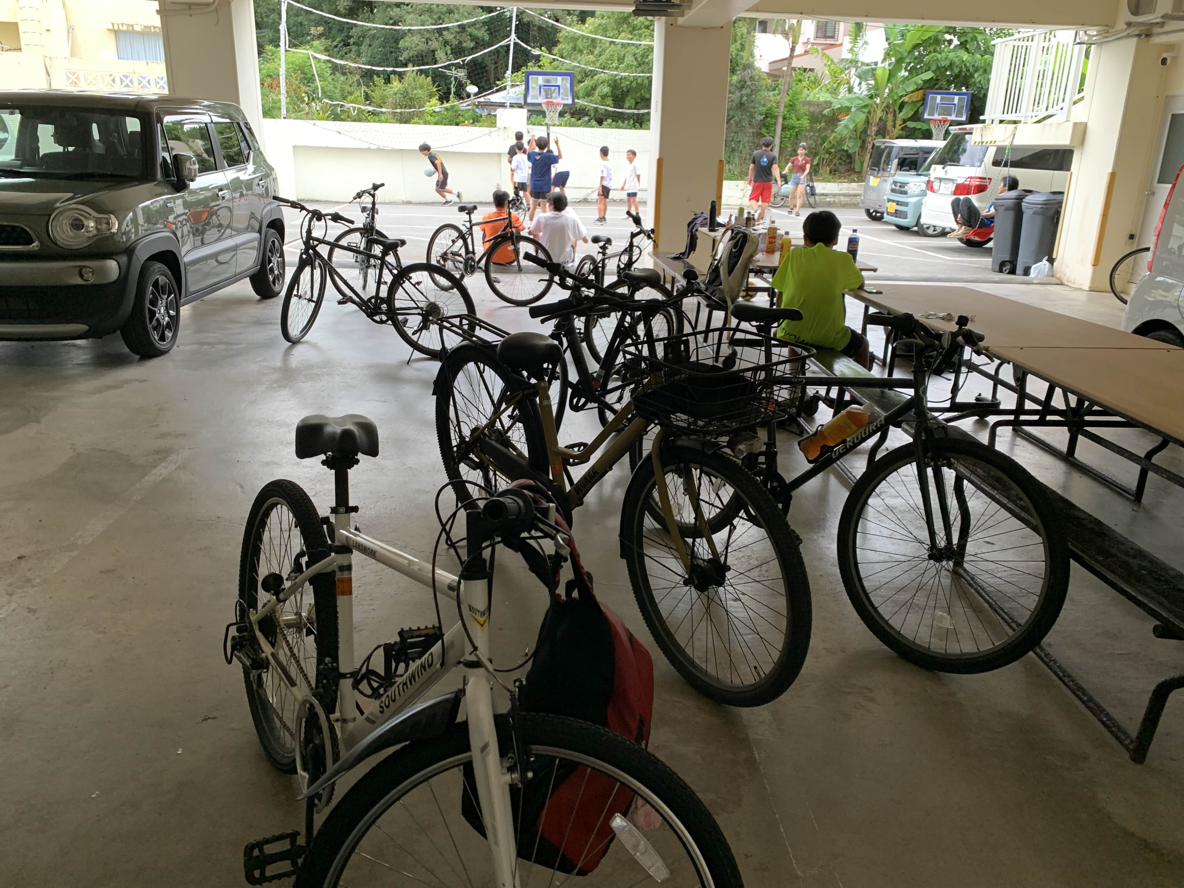 초중딩은 자전거로 와서 주차하고 청년들은 차를 타고 와 주차.
