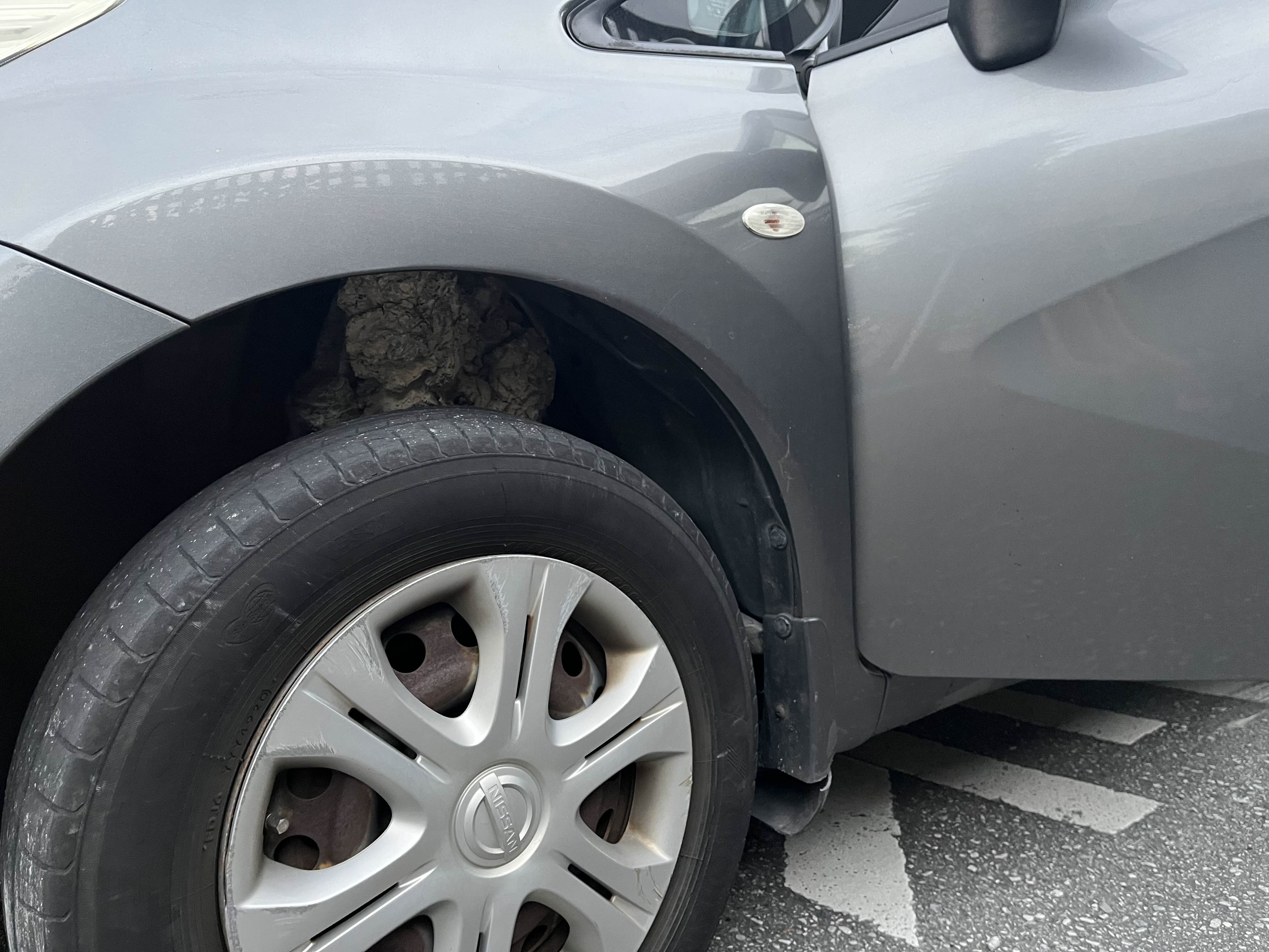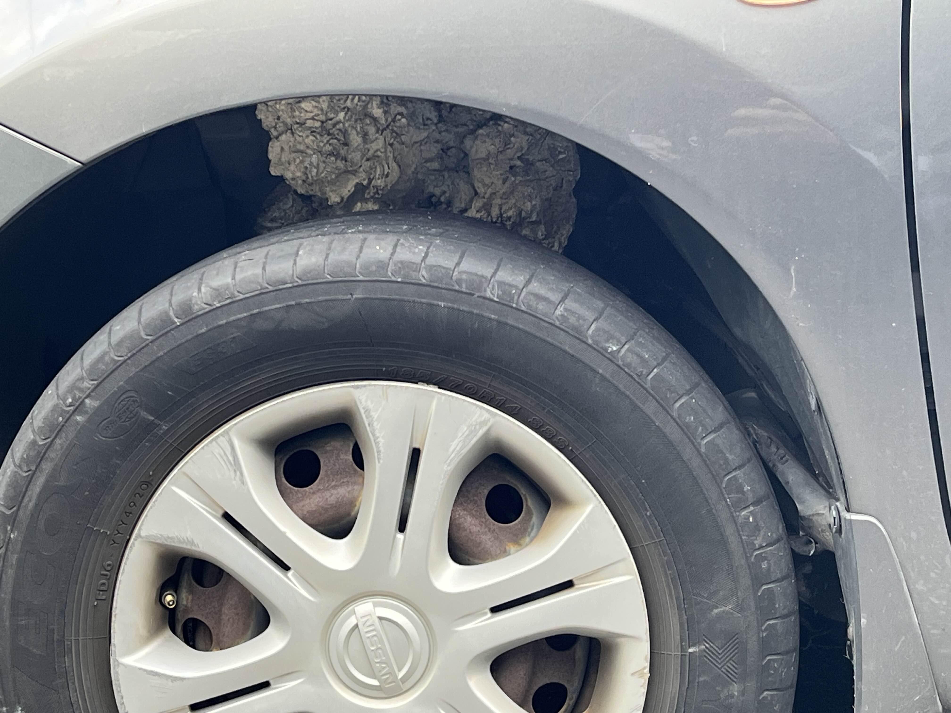 머리보다 더 넓은 시멘트 덩어리가 어떻게 타이어에 붙어서 들어가서 끼었을까? 이것은 기적이다.